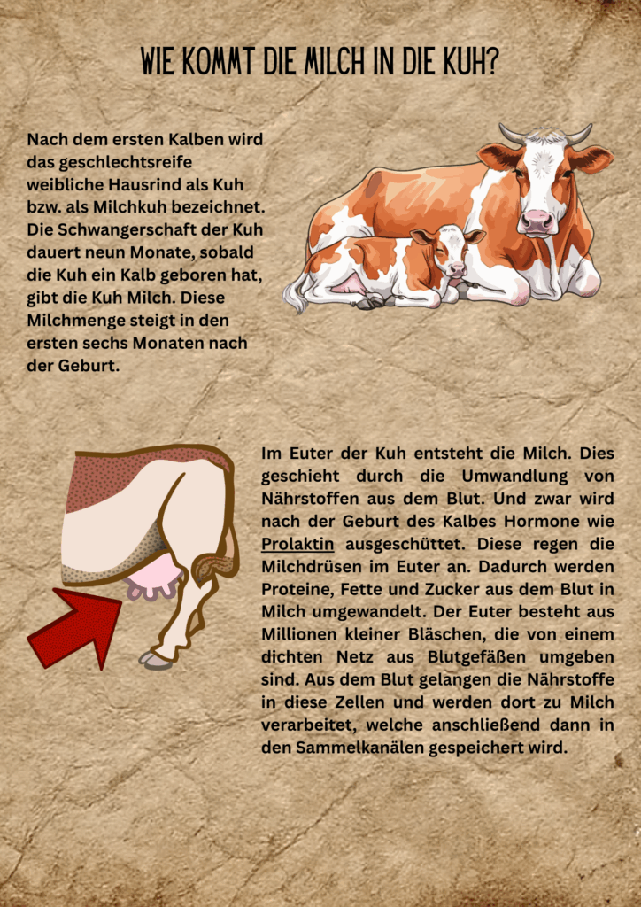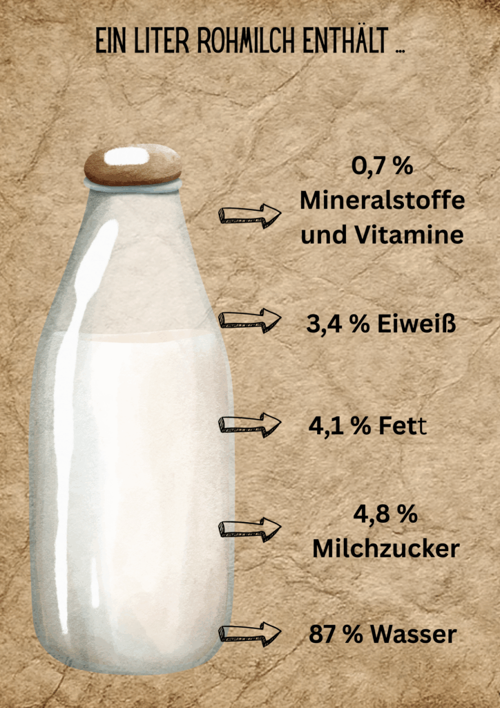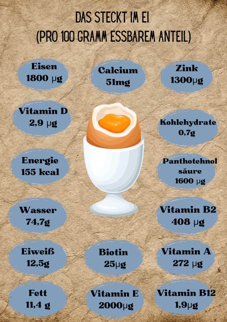 So zum Beispiel, dass Milch ein nährstoffreiches Lebensmittel ist, das hauptsächlich aus Wasser, aber auch aus Eiweiß, Fett, Milchzucker, Vitaminen und Mineralstoffen besteht. Sie ist daher eine wichtige Calciumquelle für Knochen und Zähne und liefert Proteine, die für den Muskelaufbau benötigt werden. Ebenso Eier, sie enthalten wichtige Vitamine und Proteine, wobei das Eigelb reich an Fetten und Vitaminen ist, während das Eiweiß hauptsächlich aus Wasser und Eiweiß besteht.