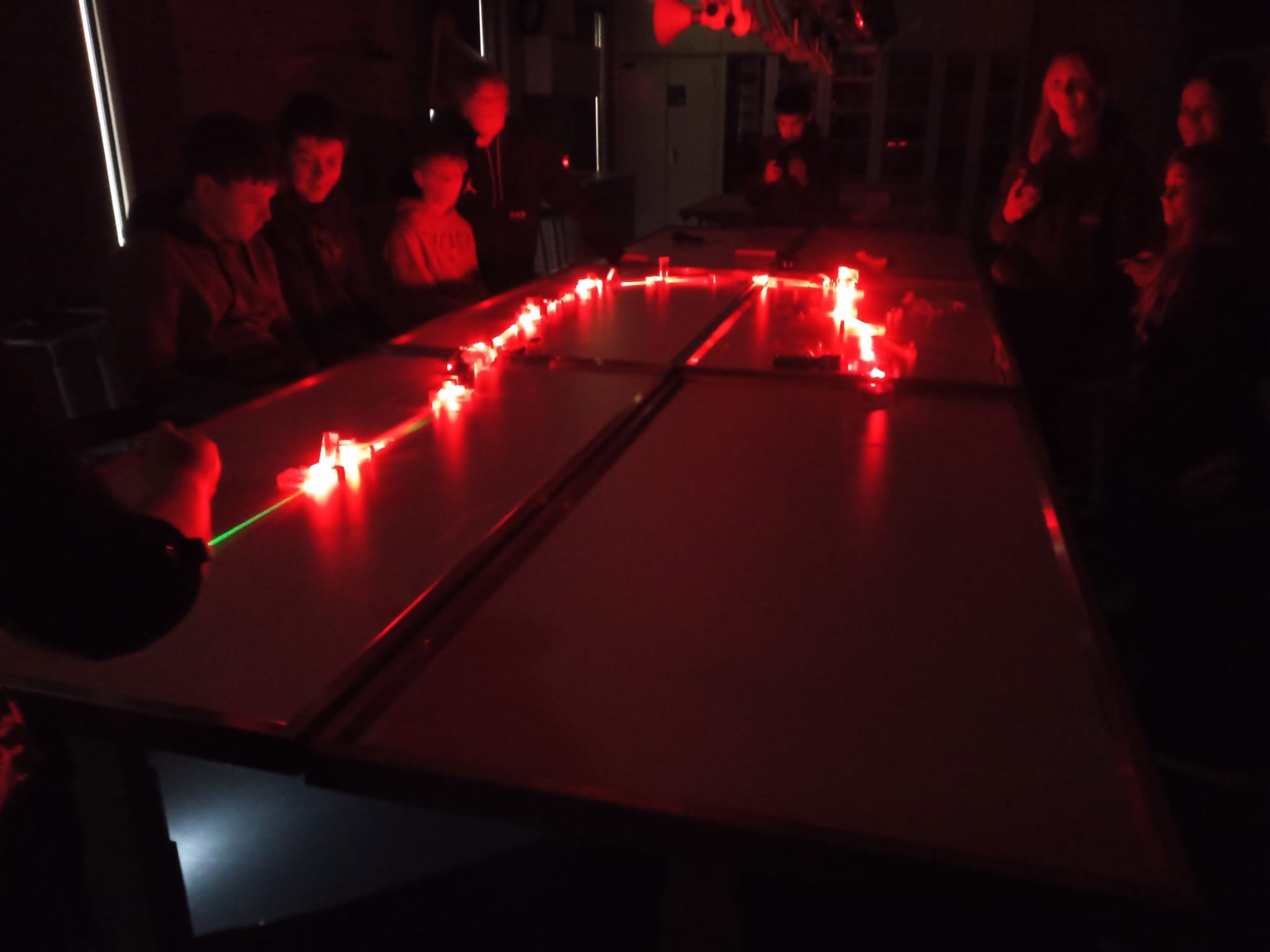 Die 22 Kinder aus dem gesamten Landkreis wurden vor Ort in zwei Gruppen aufgeteilt und widmeten sich in einem Workshop dem Thema „Lenke das Licht“. Die Aufgabe war, eine Lichtquelle mittels Hilfsmitteln wie Prismen, Spiegeln, Lupen und Verstärkern über eine vorgegebene Strecke zu lenken. Die Kinder arbeiteten in Zweier-Teams, mussten die Aufgabe allerdings als Gesamtgruppe lösen.