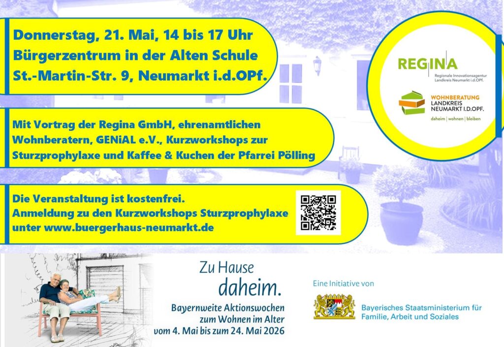 Wohnberatung ist eine ehrenamtliche Tätigkeit, angesiedelt bei der regionalen Entwicklungsagentur REGINA GmbH im Fachbereich Sozialraumkoordination in Kooperation mit dem Landkreis Neumarkt.